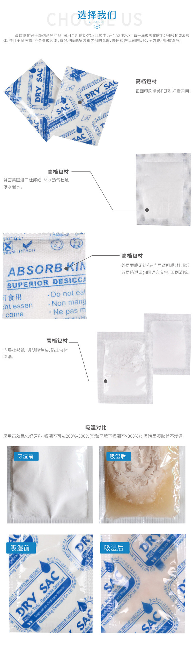 氯化钙干燥剂采用高级氯化钙原料,吸潮率高达 200%-300%,即使在实验环境下也能保证 >300% 的吸潮率。这种高效防潮特性使氯化钙干燥剂成为家具、农产品、药材、竹木制品、服装、家居用品、皮革纺织、电子电器、金属制品等行业的理想选择。使用氯化钙防潮干燥剂非常简单,只需注意将背封面朝上放置即可。为确保高效的防潮效果,建议您咨询客服人员,以便根据实际需求计算准确的用量。产品符合 RoHS、REACH、无卤、TSCA 等国际环保要求,并获得 ISO9001、ISO14001 认证。春旺的干燥剂不仅在国内市场有着良好的口碑,更是远销欧洲、北美、南美、东南亚等国家和地区。